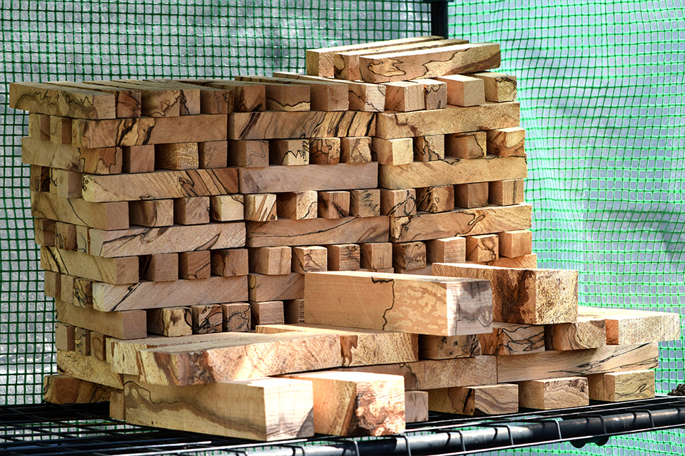 Splitting the lumber that’s the exciting part, we split then select only the best pieces of timber with lots of character for drying. We air dry almost all of our timber rather than kiln dry, we prefer this method as it produces a timber that’s is worked better and has more "life" to it than kiln dried, we know this because we also use this timber in the construction of our wedding rings.